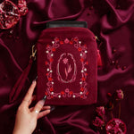 A hand holding a luxurious black velvet book sleeve with an intricate gold and silver embroidered design by The Quirky Cup Collective. The Kindle & E-reader sleeve, featuring a decorative tassel zipper, holds an e-reader, peeking out from the top. The background is a smooth black satin fabric, with dried roses and rolled-up book pages placed beside the  Kindle & E-reader sleeve, adding a vintage and elegant aesthetic to the scene.