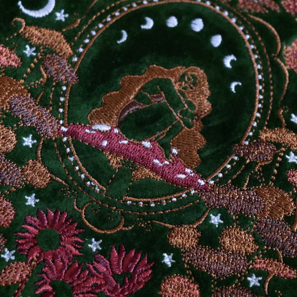 A detail of the Persephone embroidered e-reader case is held by a hand with long black nails on a blood red fabric background surrounded by roses and pomegranates. The kindle case features a wrist strap and is a red velvet colour with pink, red and cream embroidery. The design draws on an art nouveau aesthetic and features a floral frame and design alongside pomegranate and skull motifs.