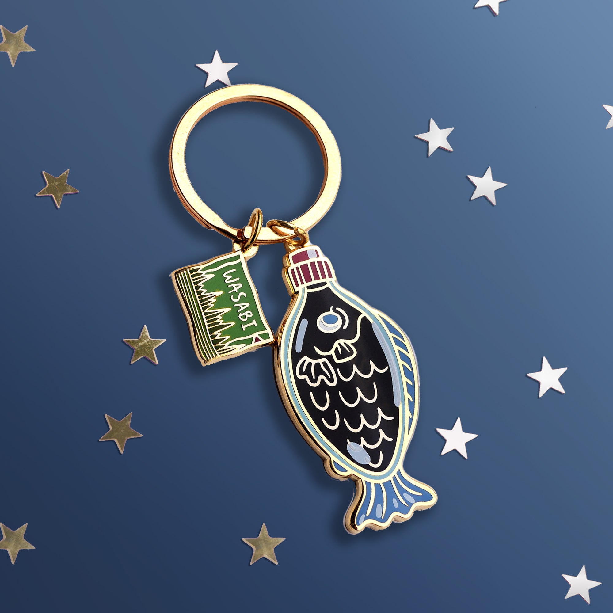 Feast your eyes on our oh-so-squishy and cute lil soon sauce bottle keyring! 🍣🐟 You know that iconic little fishy that swims right alongside your favorite sushi rolls, ready to drench them in that savory, umami goodness? Well, now you can pin that cuteness wherever you please!