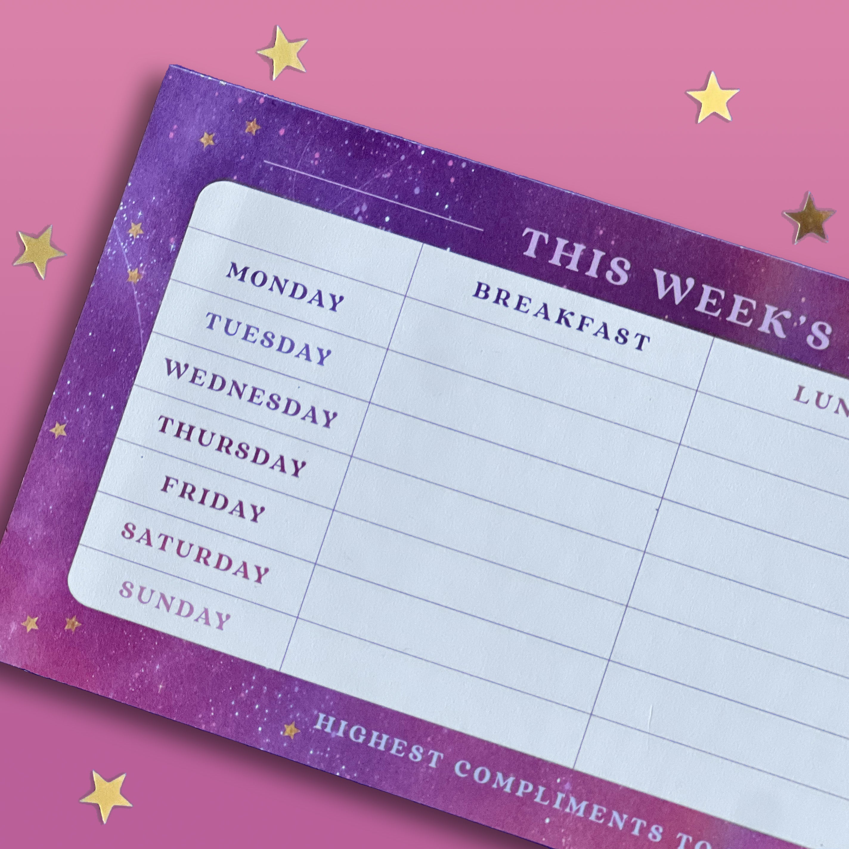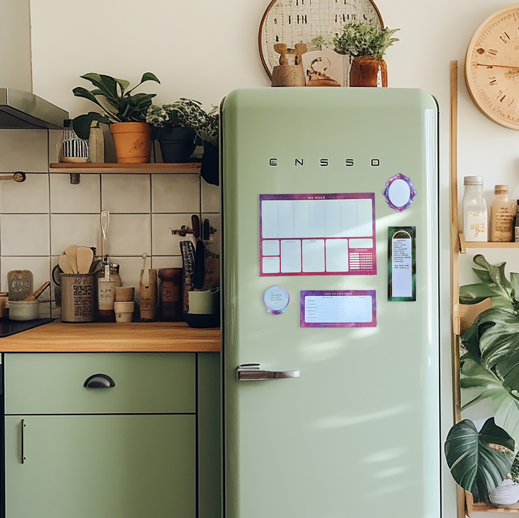 Save the brain aches and fatigue of decision making so you aren't stuck eating tuna and rice for dins or some weird old thing you found in the freezer. Have all of your meals laid out and ready to go with our Meal Planning notepad that conveniently has magnets so it can live on your fridge.Β