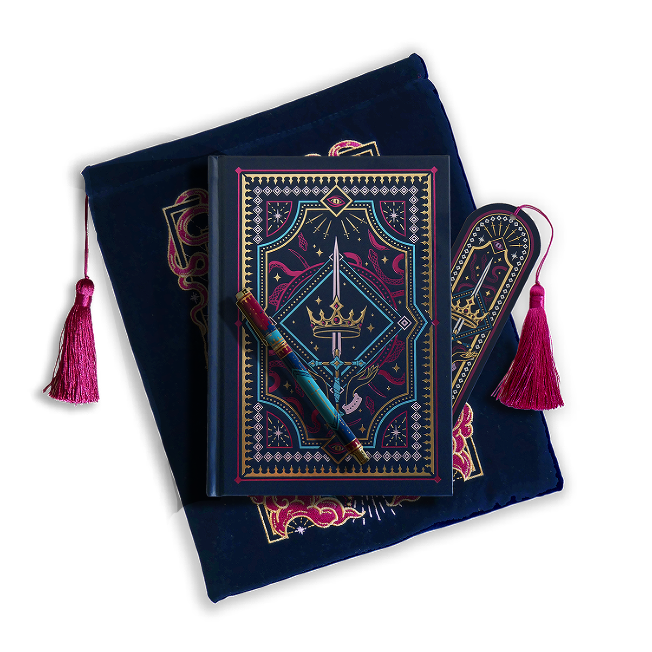 The journal bundle from the Serpents & Swords collection. This navy blue variation includes a book sleeve, journal, pen and bookmark from the collection. All feature a design with motifs of crowns swords and snakes in shades of bright pink, gold, and aqua. The journal, pen and bookmark feature gold foiling while the velvet book sleeve is embroidered. The sleeve and bookmark also feature bright pink tassels.